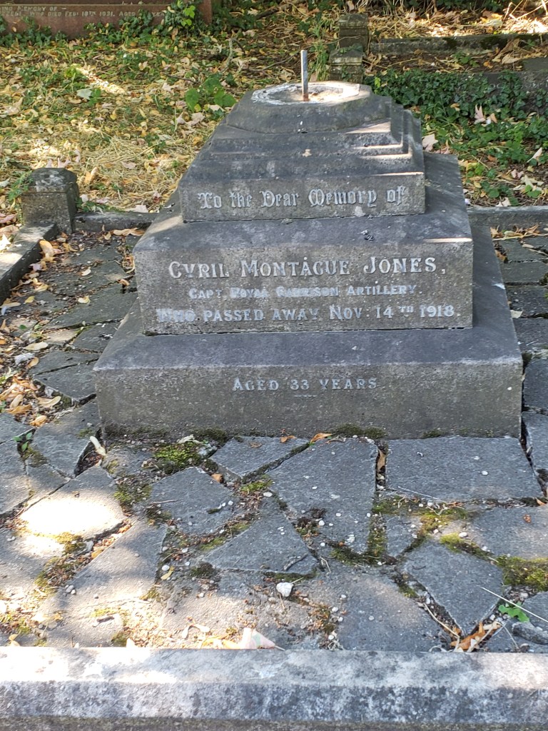 Cyril trained as an architect but on April 1, 1915 he enlisted with the Royal Navy serving on the President before transferring to the Royal Garrison Artillery (RGA). Lieutenant A Captain Cyril Hammond Montague Jones died on November 14, 1918 at the 2nd Eastern General Hospital, Brighton. He was 33 years old. He was buried in Radnor Street Cemetery on November 20 in plot D15A.