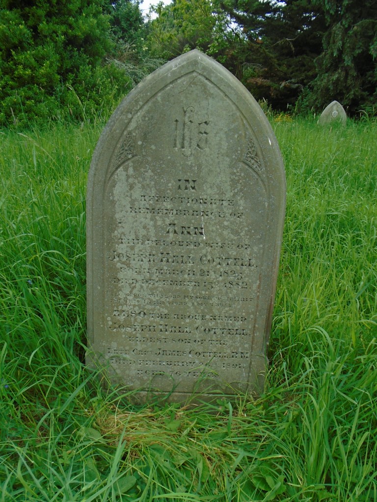 Buried in plot A174 is James Hall Cottell and his wife Ann. The family does not appear to have a long association with Swindon nor the clock and watch making industry come to that. James worked as a clerical assistant most of his life, later becoming a brewer’s manager. He died in February 1891 at Bedminster, Bristol. His father, James Cottell, was a Captain in the Royal Marines, as is mentioned on the headstone – see below.