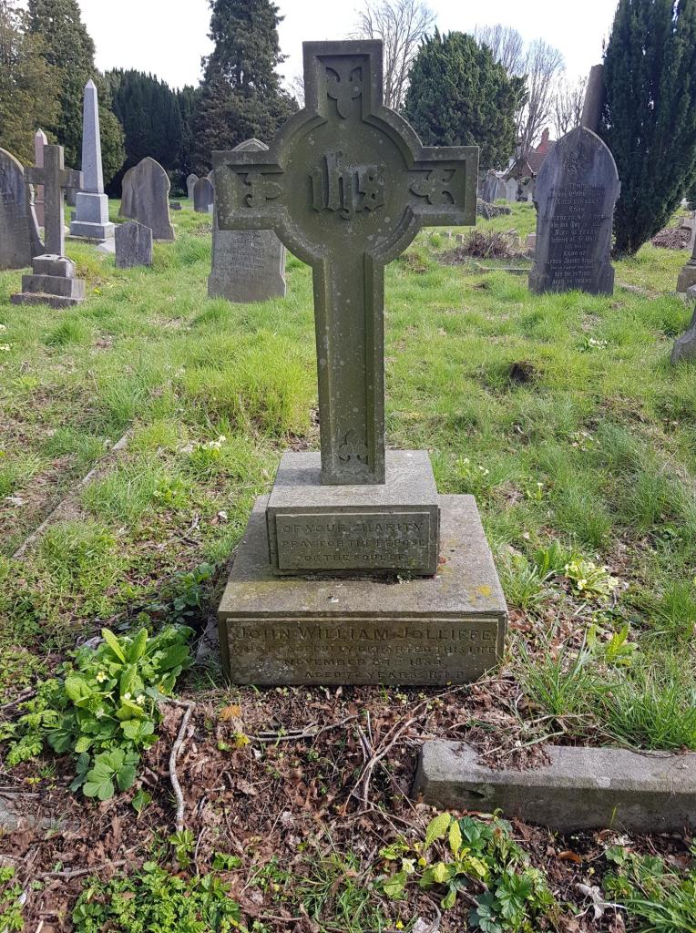 John William Jolliffe was buried on November 27, 1884 in grave plot E8290. His wife Elizabeth died in 1885 and is buried with him.