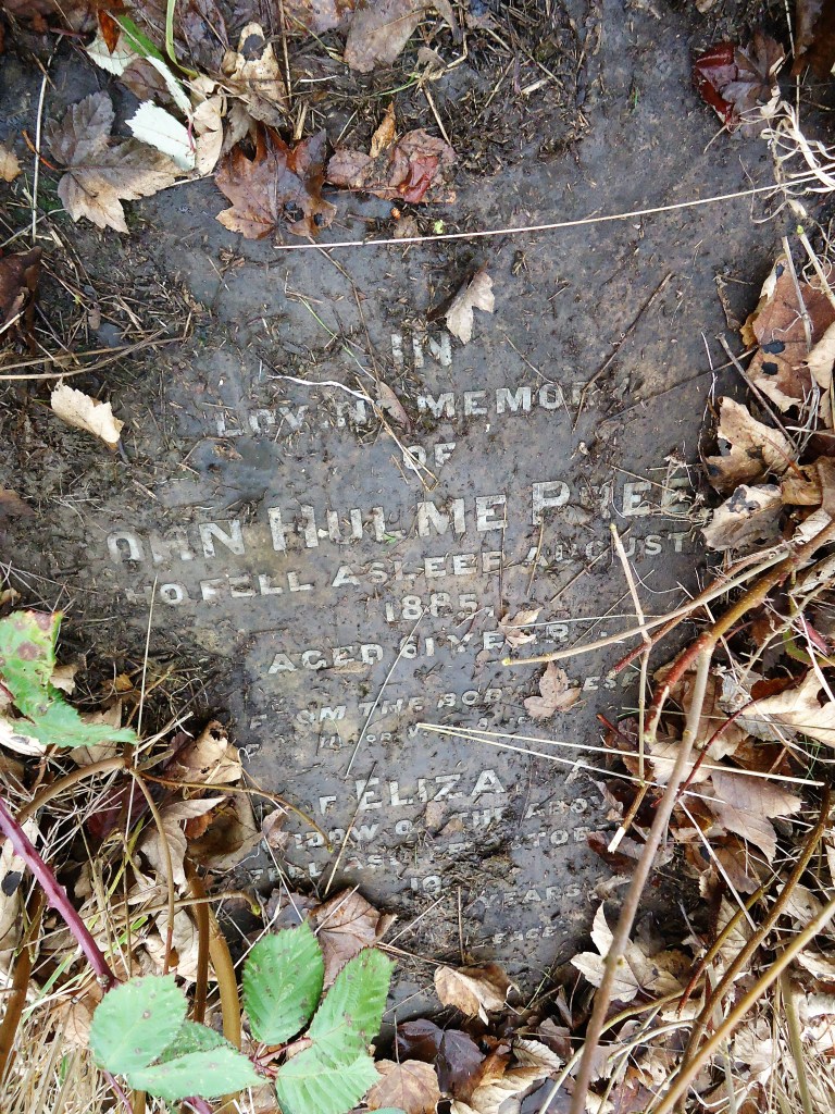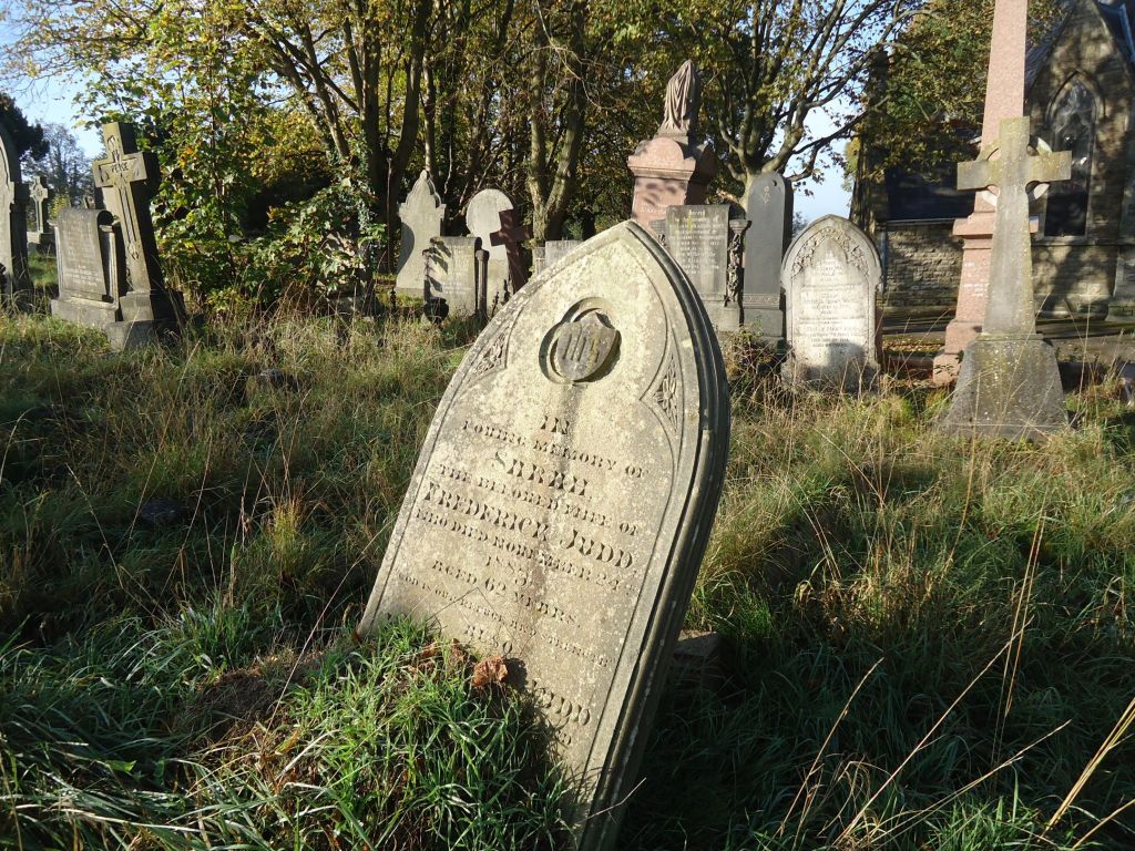 Basking in the sunshine, the leaning headstone has a large ants nest obscuring the last inscription, probably the name of Sarah’s husband Frederick who died in 1907 at his home, 53 Crombey Street.