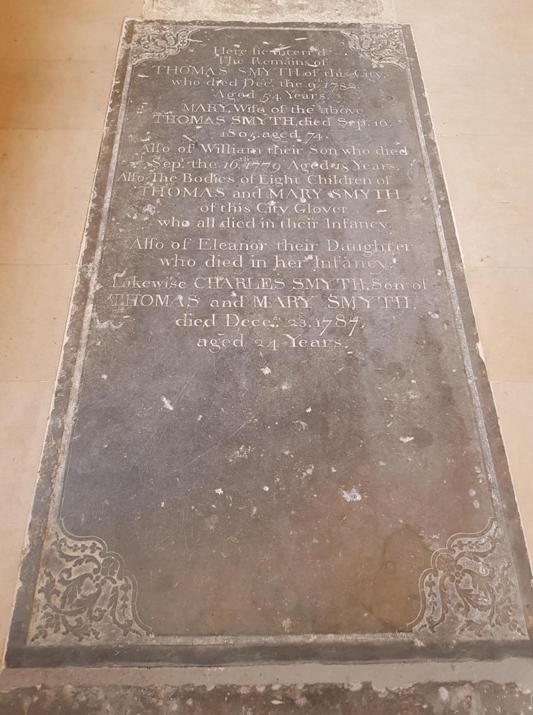 Remembered here is the Smyth family. Thomas who died on December 9, 1782 aged 54. Buried with him are his wife Mary, eight of their children, and a daughter named Eleanor, who all died in infancy, two sons, William who died in 1779 aged 18 and Charles who died in 1787 aged 24.