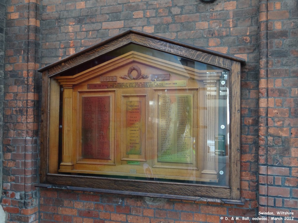 On the centre panel are inscribed the names of the eleven shopmen who paid the supreme sacrifice. They were: A.H. Cox, W.R.H. Wilson, T. Lockey, W.H. Joyce, J.V. Jones, A.R. Loder, E.R. Whitman, A.H. Lambourne, T.D. Yeo, C. Nash, W.F. Ford.