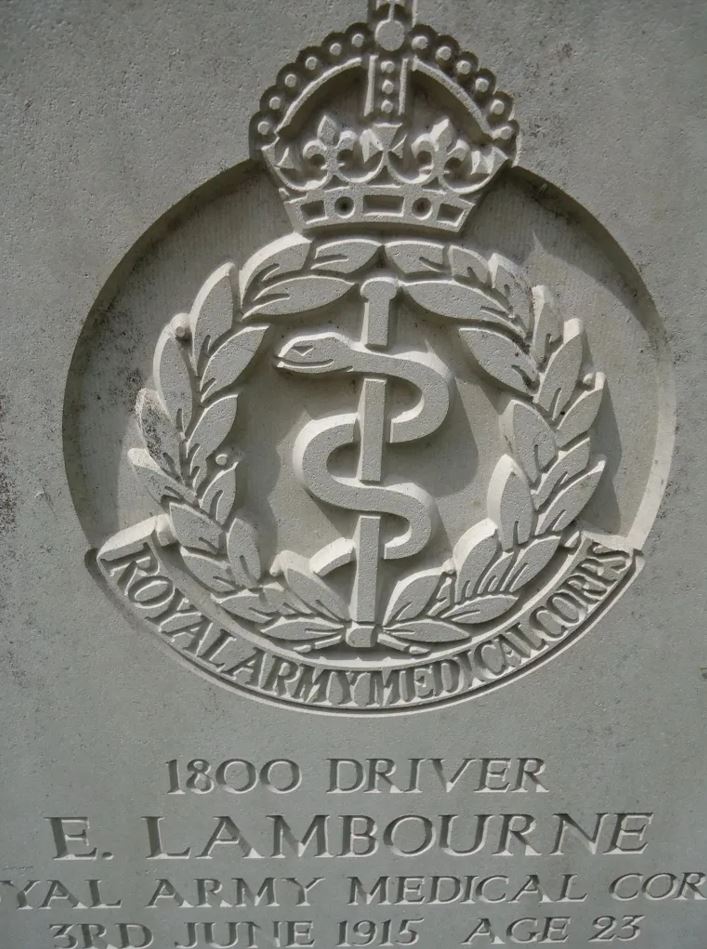The Commonwealth War Graves headstones all carry the regimental insignia of the deceased service personnel. This is the badge of the Royal Army Medical Corps.