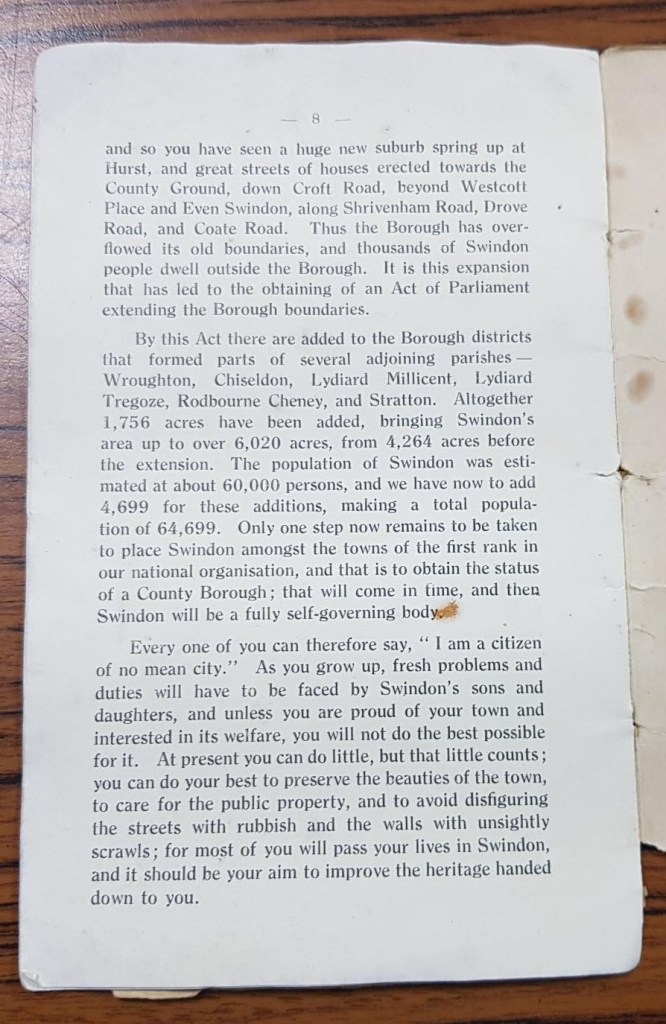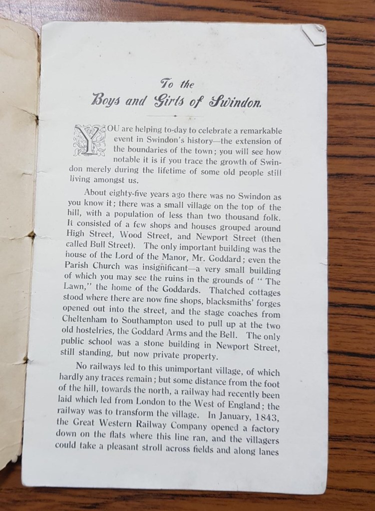 And then Mr Rumble showed me a booklet his father was presented with as a schoolboy in 1928 – Borough of Swindon – Extension of the Borough 1st October 1928.