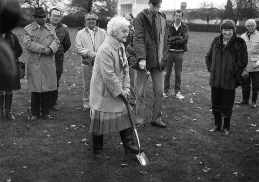 Bob’s mother Emily cutting the first sod at the County Ground athletics track in 1984.