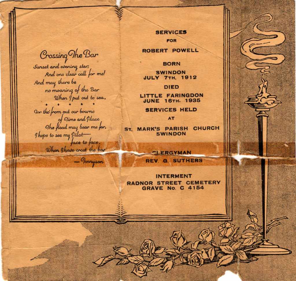 The funeral took place on Saturday of Mr Robert Powell, of 5, Carr Street, Swindon. Mr Powell met with a motor accident at Little Faringdon last Saturday. He was taken to Fairford Cottage Hospital, where he died on Sunday morning. He would have been 24 years of age next month. Mr Powell was well known in Swindon and was a member of the Boys’ Red Triangle Club. He was apprenticed in the GWR Works as a fitter and turner, and at the time of the accident was working for an engineering firm in Coventry. The funeral service was held at St. Mark’s Church, and the interment at Radnor-street cemetery. Rev. T.J. Barrett officiated.